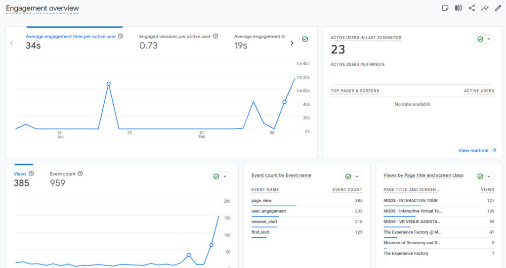 The Experience Factory isn’t just an immersive digital environment — it’s a fully instrumented learning ecosystem. Every interaction, map tap, VR engagement, video view, and content pathway can be intelligently tracked and analyzed to reveal how visitors explore, what captures their attention, where they spend time, and where engagement drops off. This level of behavioral insight transforms the experience from a static presentation into a living feedback loop.