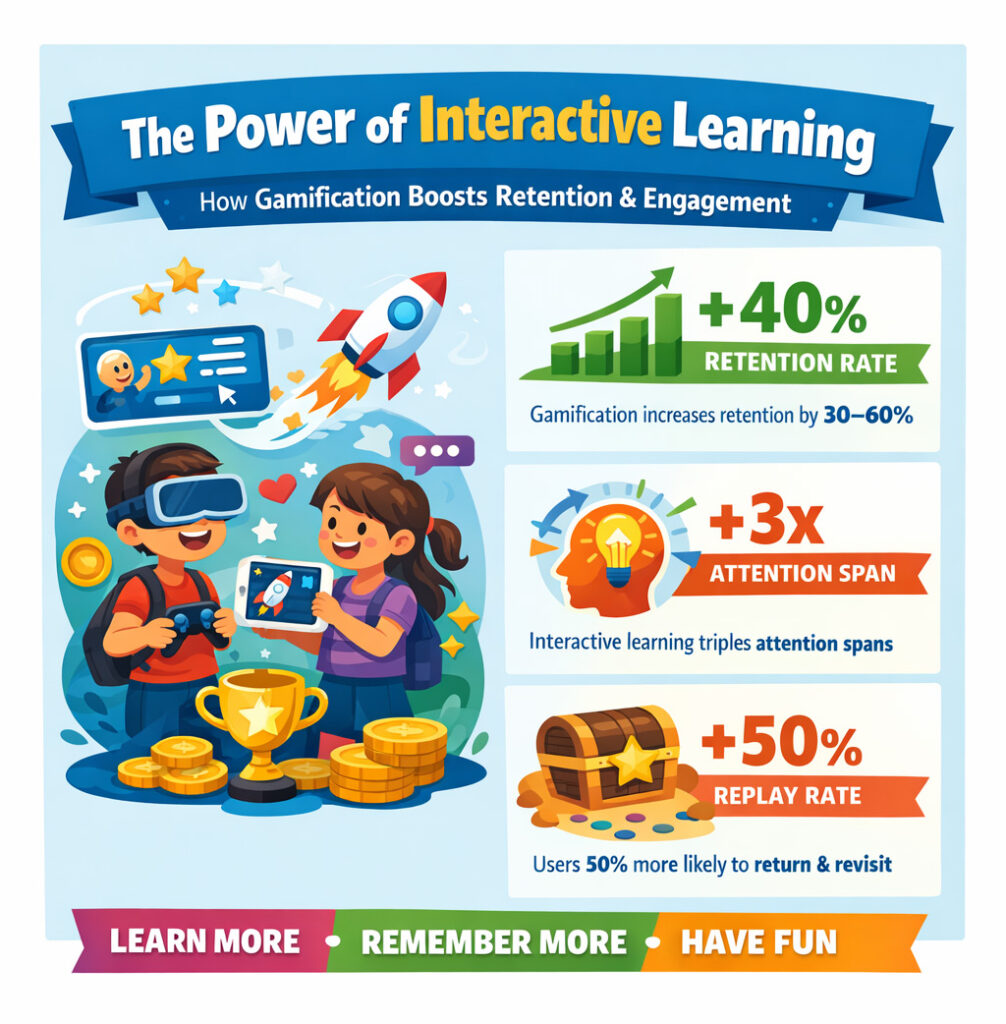 Educational research consistently shows that interactive and gamified learning experiences dramatically outperform passive content. Studies indicate that: